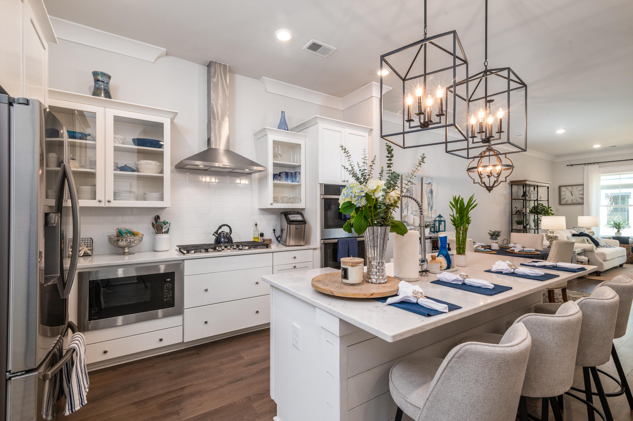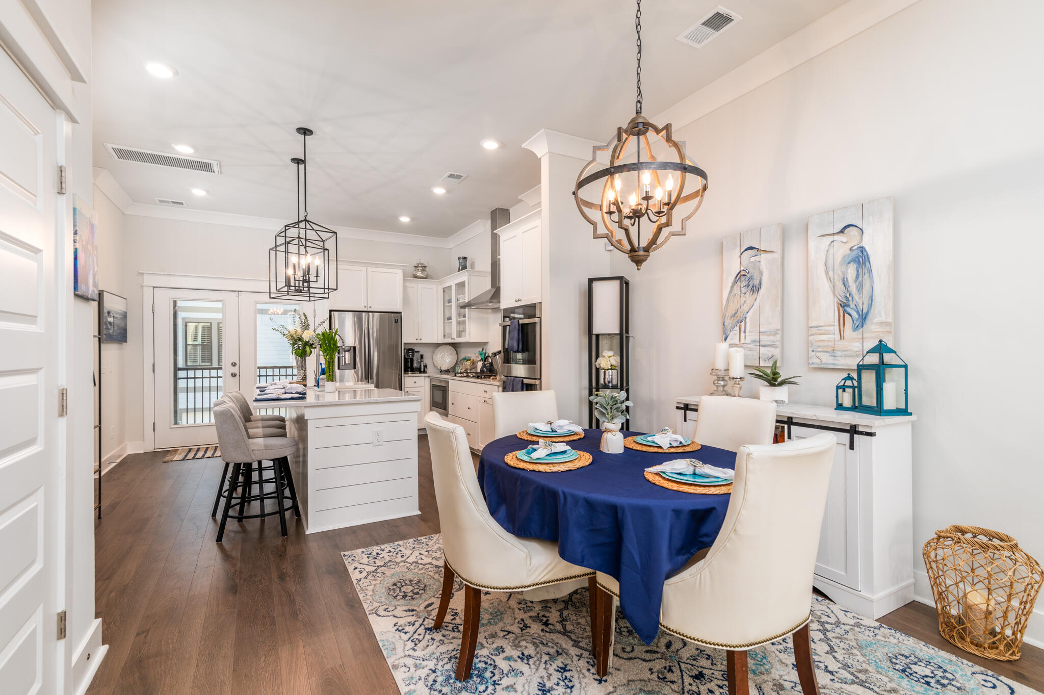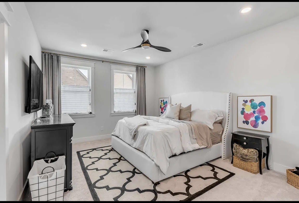 Welcome to Midtown, located in the center of it all! This stunning 4-bedroom, 3.5 bath upgraded interior, 3 floor unit townhome is sure to please. Prepare to be amazed from the moment you open the door of this home. Upon entering, you will find the first floor to have a welcome foyer, multiple closets and a large bedroom with full ensuite. The extended hall will lead you out to the 2 car attached garage. Venture up to the 2nd floor where you will find an open living space consisting of your beautiful gourmet kitchen an island with breakfast bar, built-in drawer-style microwave, and shiplap surround. The stainless steel appliances include a 5-burner gas cooktop with hood vent, dual wall ovens, dishwasher, and refrigerator. The kitchen also has quartz countertops, custom white cabinets withglass uppers, a walk-in pantry, and full-light French doors that lead to the covered patio. There is also a large area to fit a dining room table and chairs off of the kitchen. After dinner, relax on your oversized, private covered porch or retire to the large living room to entertain your guests. A guest powder room is also included on the main level.
